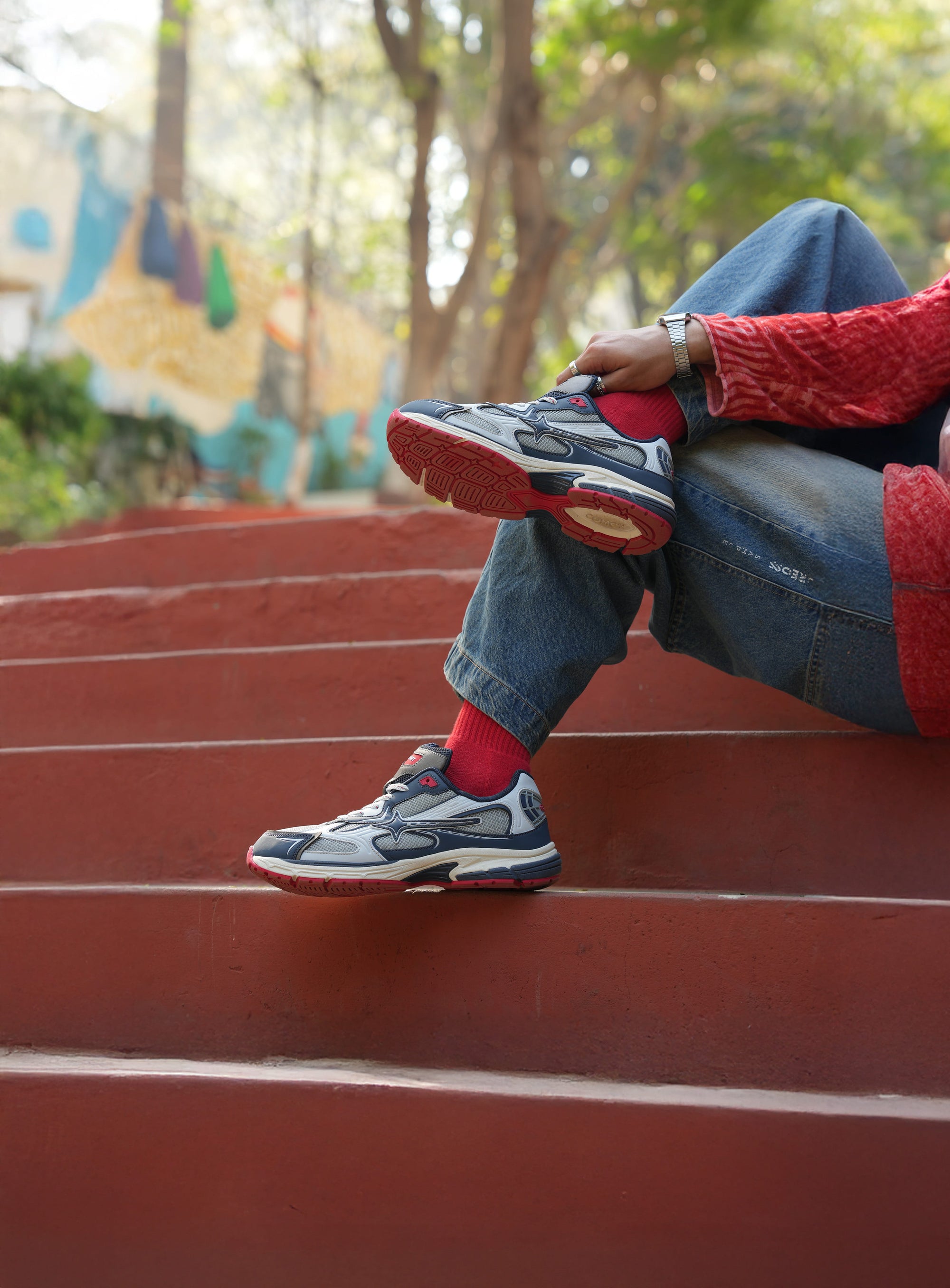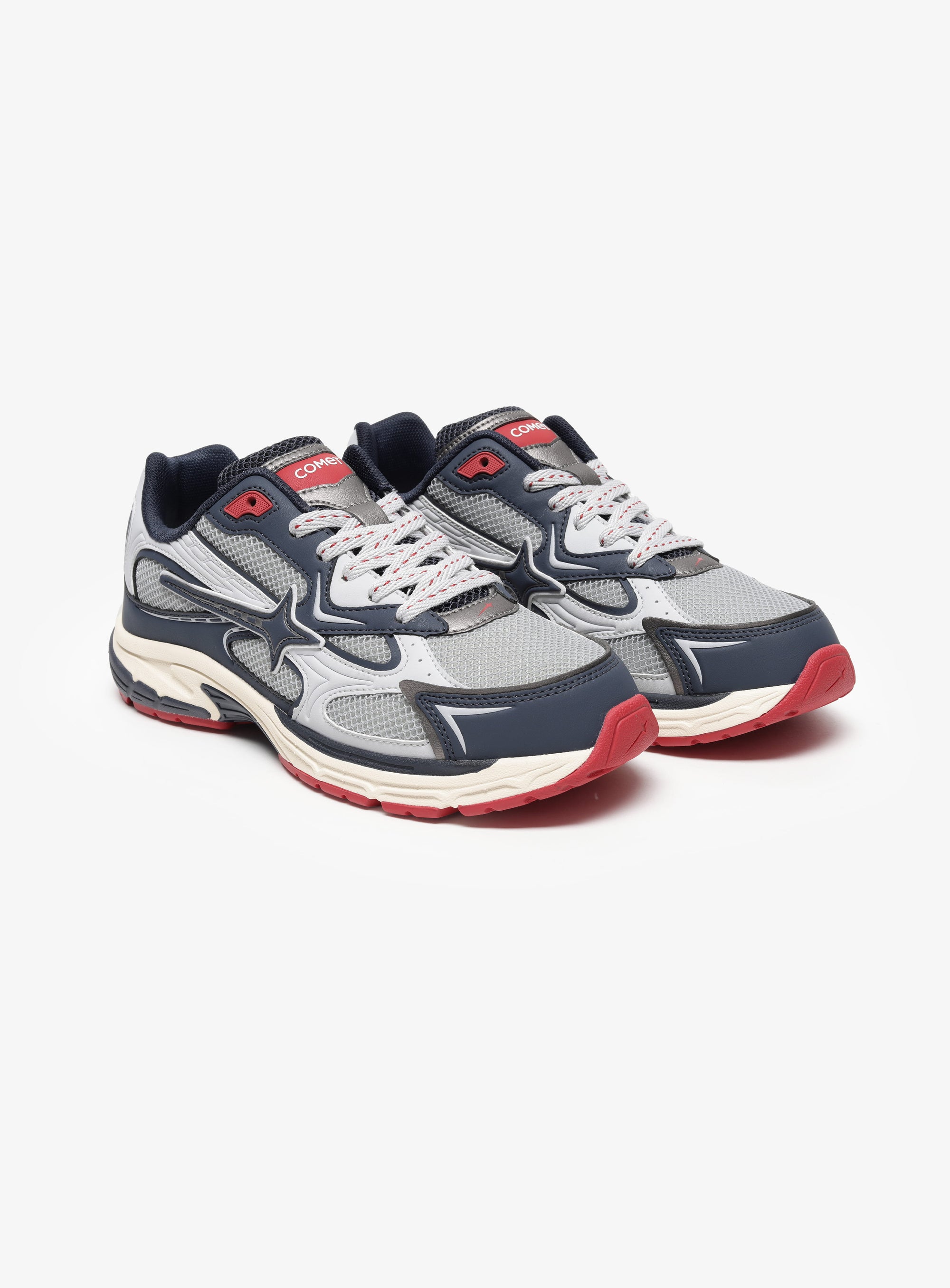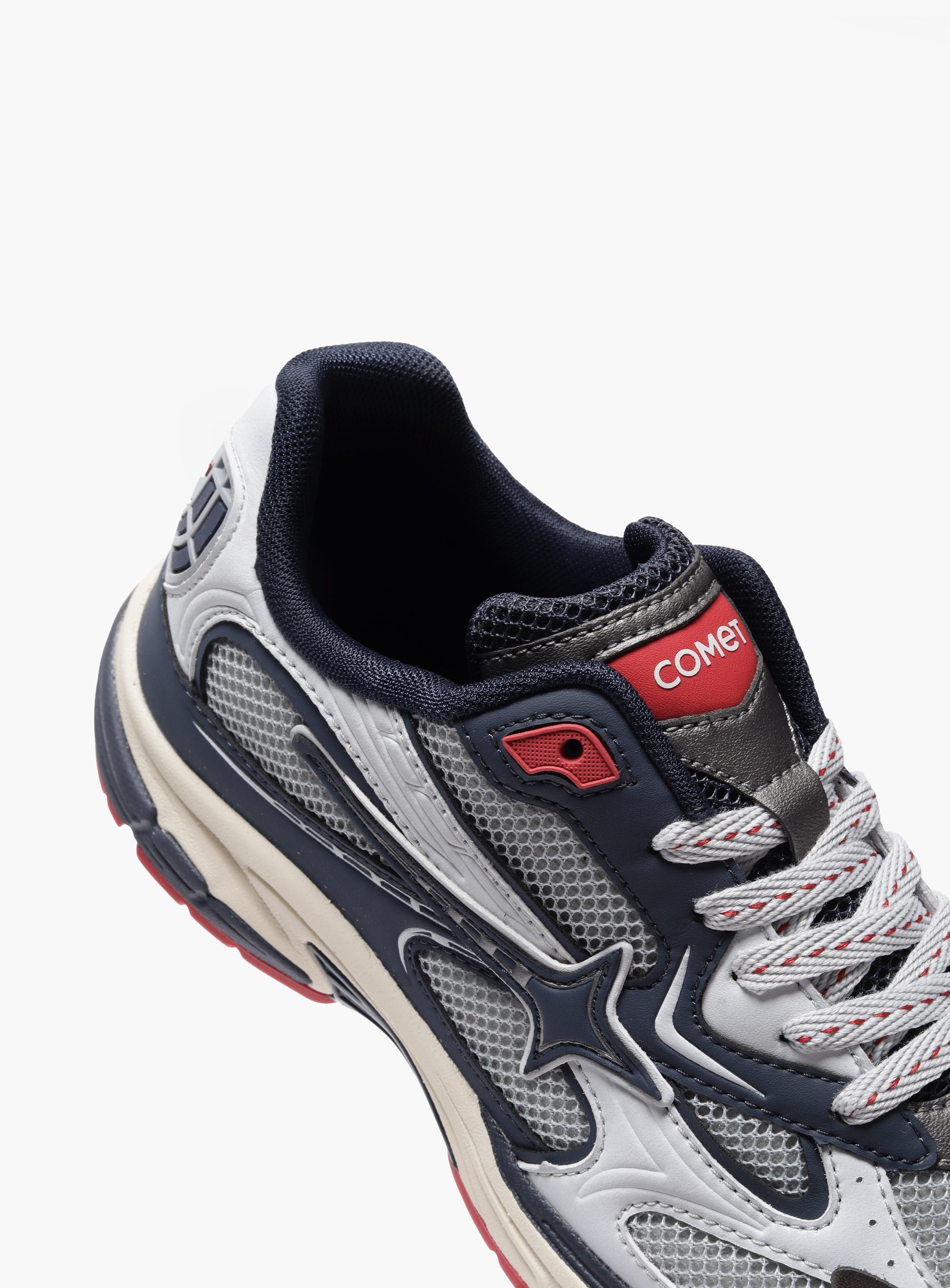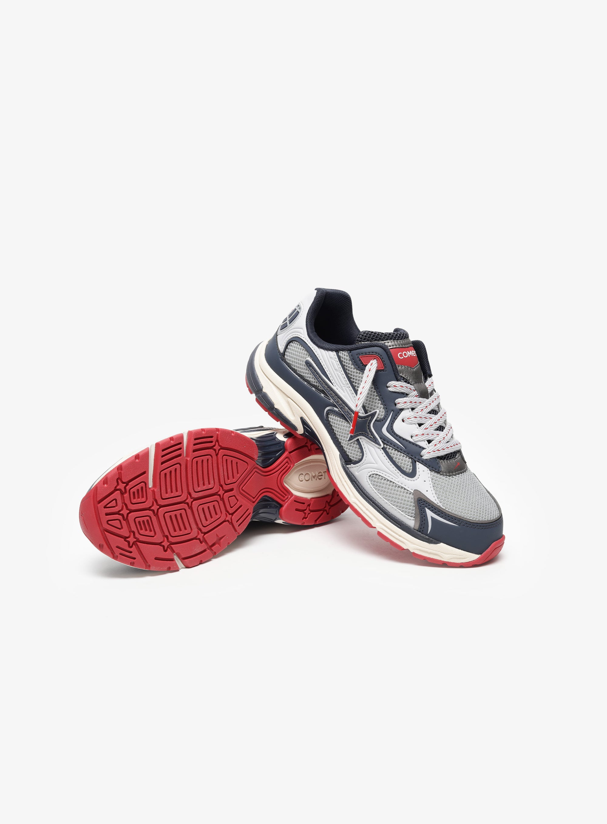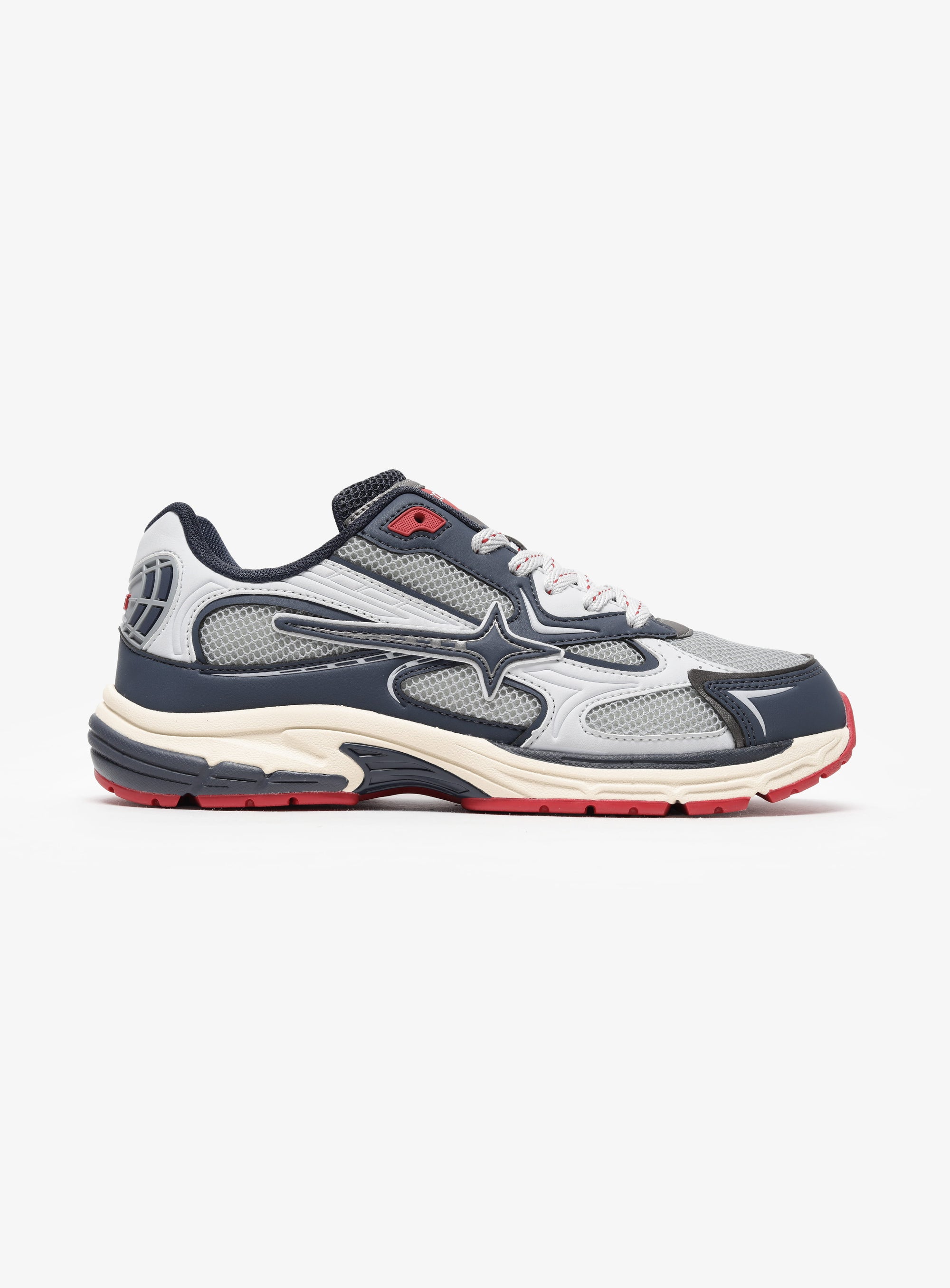 Stratos is a sport-inspired lifestyle sneaker named after the layer where extremes are regulated. The upper stays controlled in blue and grey, while energy is grounded through the red outsole. Every element is positioned to manage pressure rather than amplify it, keeping movement balanced