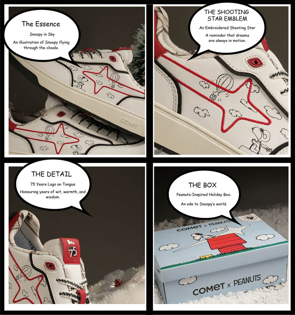This Holiday Special captures the calm confidence of flight. Drawing from Snoopy’s iconic Flying Ace days, this white colourway places him high in the open sky, where imagination feels limitless and hope comes easy. The crisp white upper is paired with soft, sky-inspired prints that keep the design light and uplifting. A comic strip–inspired sole adds a layer of storytelling below, while thoughtful 75th anniversary details honour 75 years of Peanuts’ enduring optimism. It’s a reminder that sometimes, simply looking up is enough to keep going.